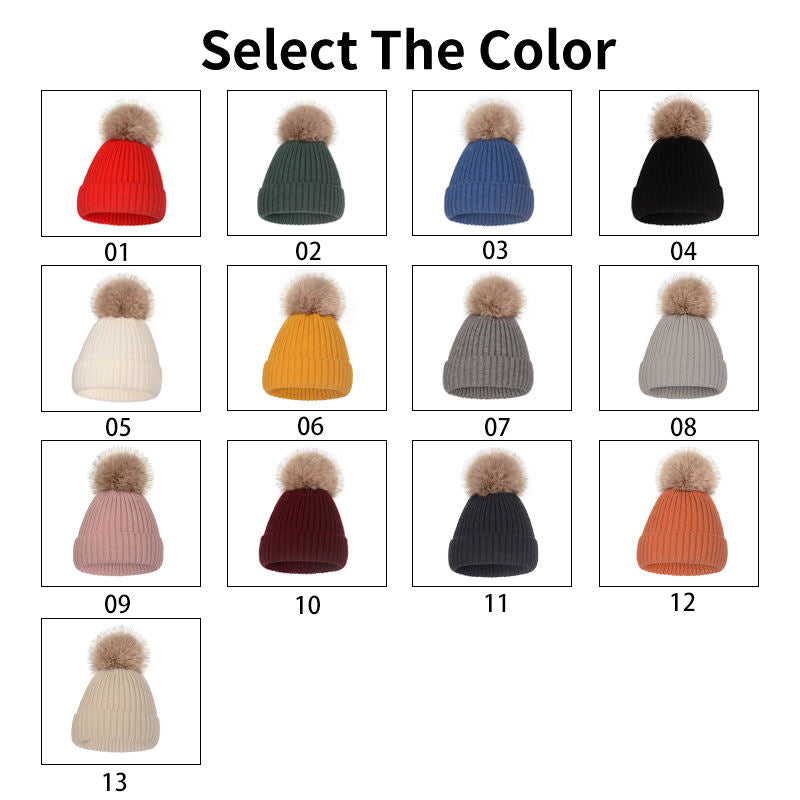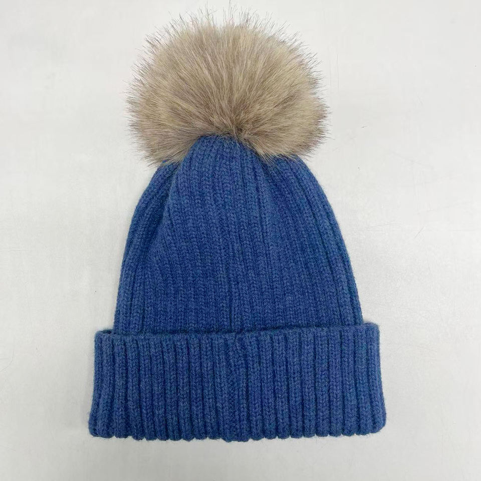 Custom Logo Knitted Beanie Cap High Quality Faux Fur Winter Hats With Pom Pom for Women Men