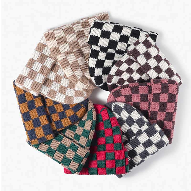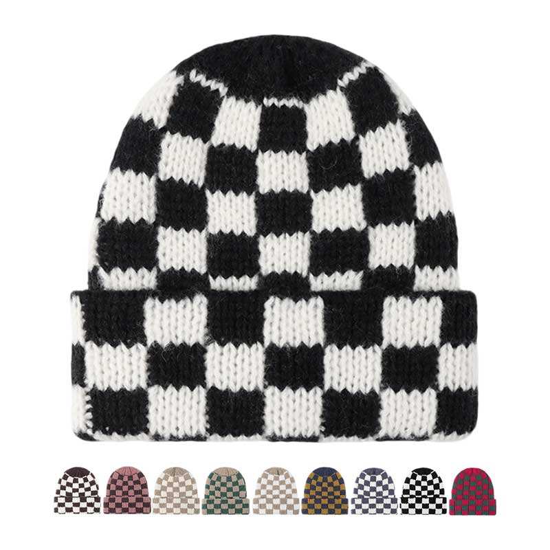 Wholesale Custom Logo Checkerboard Plaid Ribbed Winter Warm Cuffed Knitted Hat Beanie for Men Women