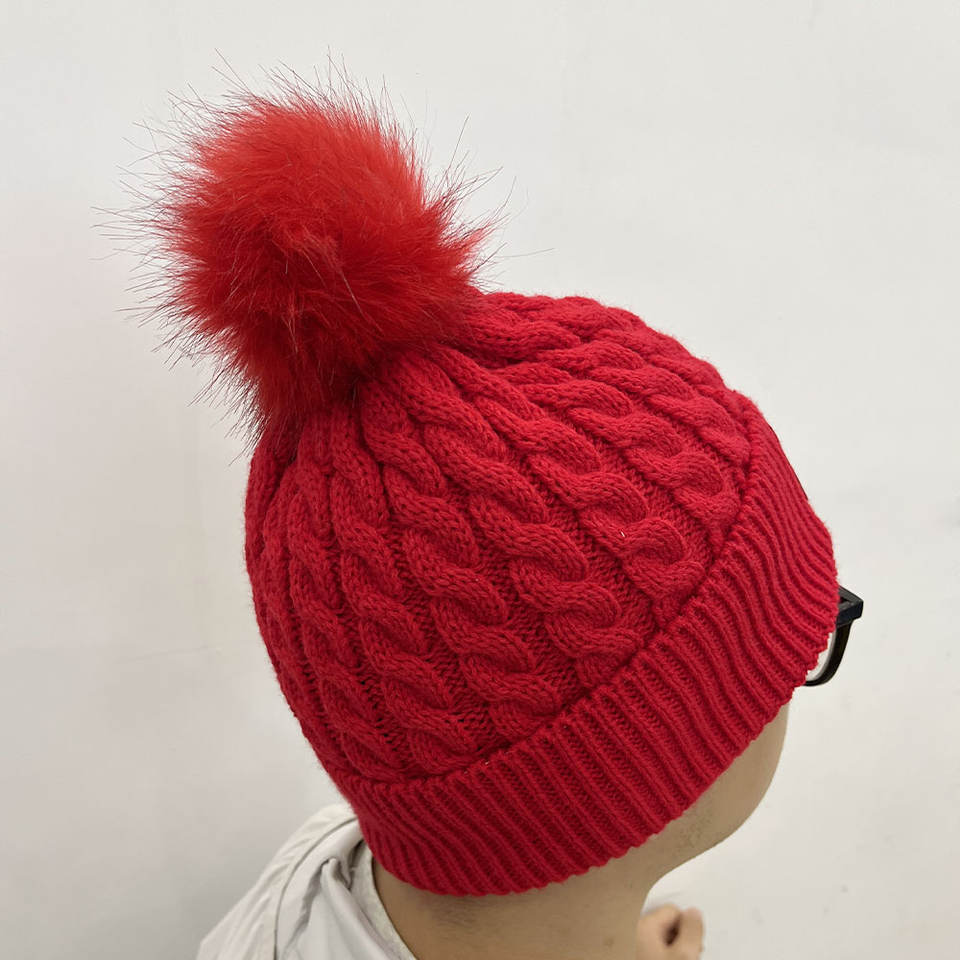 Wholesale Factory Price Winter Thick Cable Warm Knit Skull Cap with Faux Fur Pom,Pom Pom Beanie Hat for Women