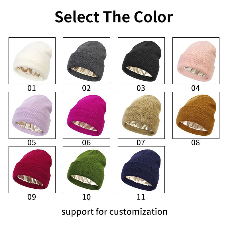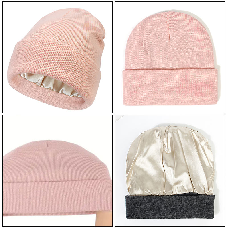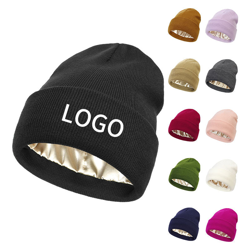 Wholesale New Design Custom Logo Acrylic Satin Lined Knit Winter Warm Silk Satin Lined Beanie Hats Cap for Men and Women